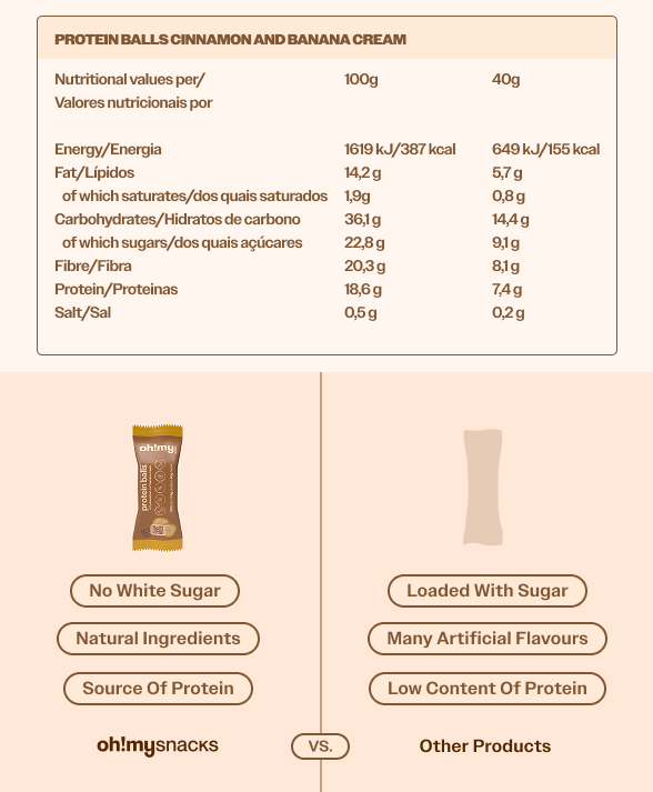 We wanted a snack that feels like banana bread in a bite. So we mixed good protein, oats, and dates, then added a soft banana cream and a warm touch of cinnamon. We've created this snack to give you a boost of protein, fibre and healthy fats to fuel your day.