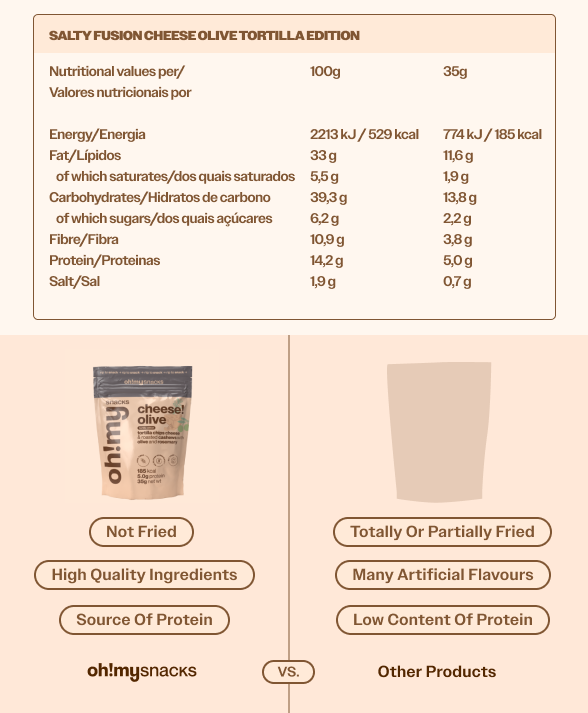 Our Salty Fusion Cheese Olive Tortilla pairs the satisfying crunch of corn chips with the creamy, savoury taste of cheese and the rich flavour of olive-seasoned cashews. This delicious snack is perfect for any time of day and comes with added benefits—it’s a source of fibre, protein, and omega-3, helping to support both your cardiovascular and cognitive health.