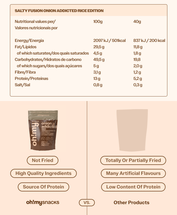 Our Salty Fusion Onion Addicted Rice enhances the flavour of onion trough the combination of crispy brown rice chips with the creamy, tangy goodness of sour cream and onion-seasoned cashews. It’s the perfect snack for onion lovers looking for a savory crunch and for those seeking for a good nutrition to promote cardiovascular health at the same time.