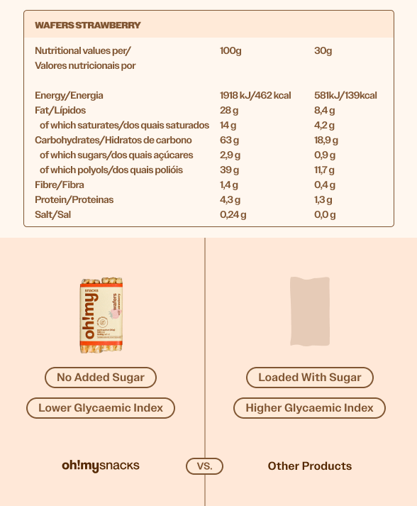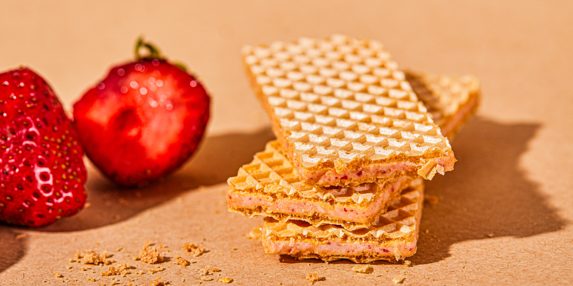 We wanted a wafer with fruity flavour. So we baked crisp layers and filled them with a smooth, strawberry-style cream. Delicious joy, with no added sugar, to avoid the negative consequences of excessive white sugar intake.