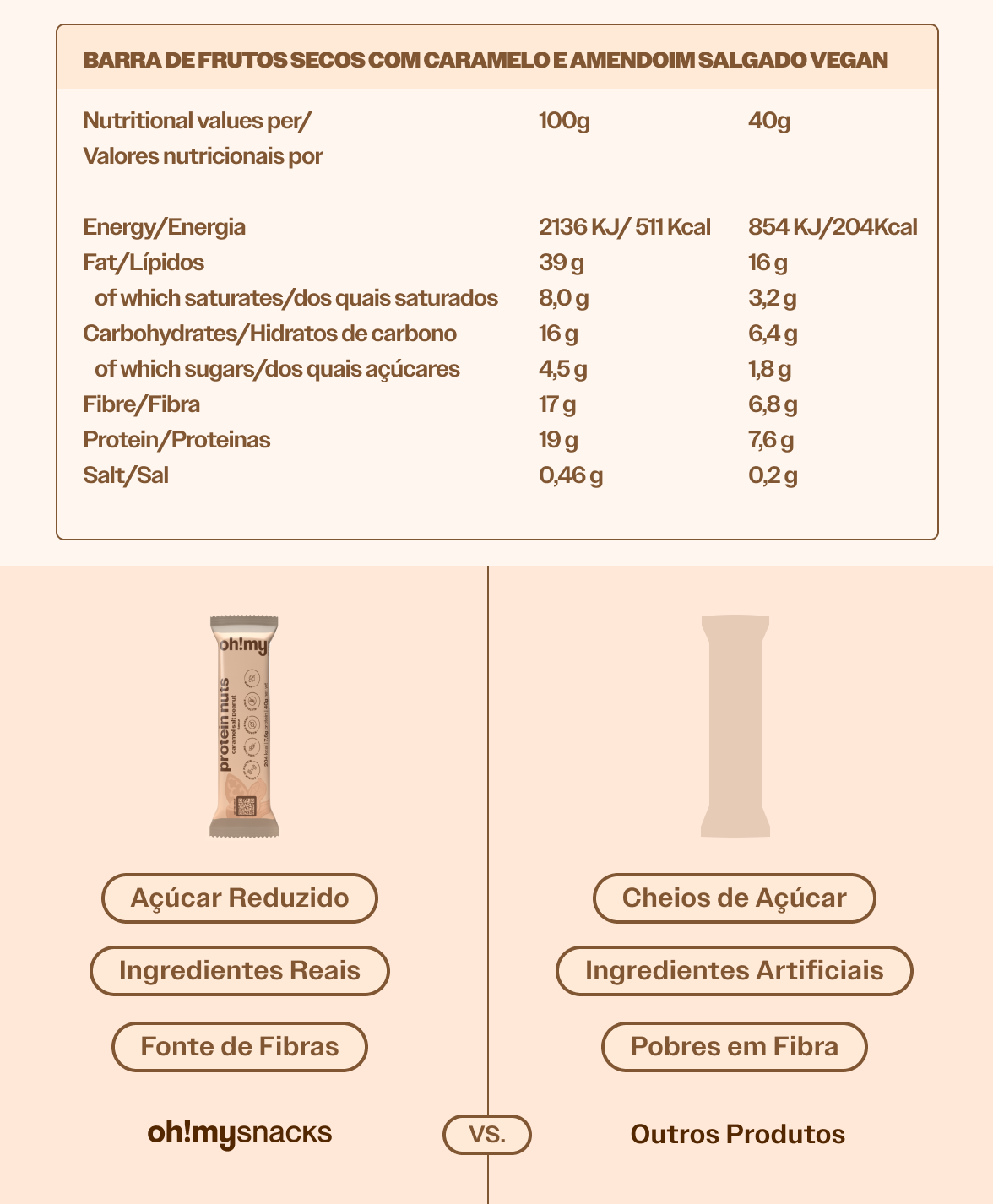 A nossa Barra Proteica de Frutos Secos com Caramelo e Amendoins Salgados é uma combinação perfeita de sabores doces, salgados e de nozes, criada para satisfazer os seus desejos, mantendo-se à base de plantas e nutritiva. Quisemos pegar nesta mistura clássica e criar uma opção vegan que conservasse toda a indulgência, oferecendo um equilíbrio de ingredientes naturais e os benefícios da proteína vegetal.
